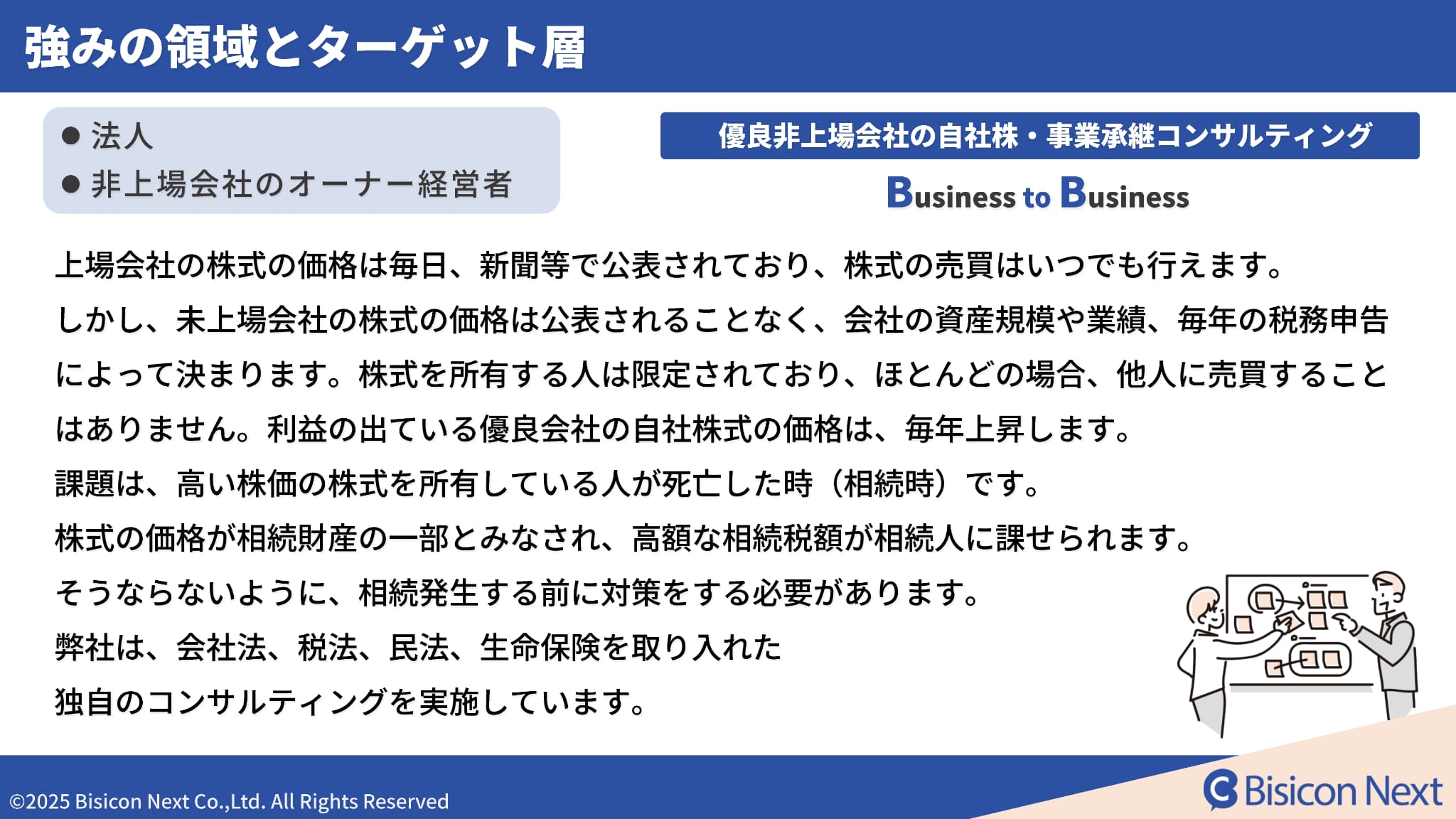 自社株式の持ち方と相続税の問題の解決は、経営者人生の最後の仕事になります。自社株式のあり方を制度設計するコンサルティングが、自社株式コンサルティングです。