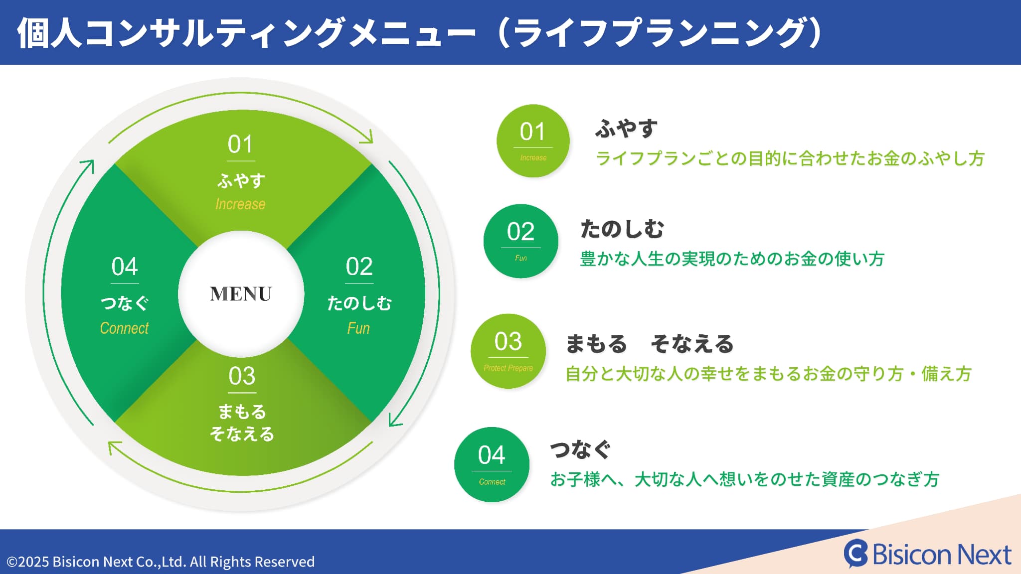 今後過ごしていきたい人生や、お金に関する悩みをお伺いし、解決に向け一緒に考えていきます。お客様の価値観はお一人お一人異なりますので、固定観念にとらわれずヒアリングすることを意識しています。